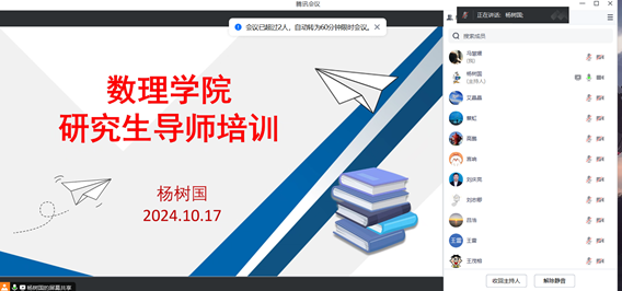会议伊始,杨树国院长介绍了今年研究生师生互选的概况,强调了导师在研究生培养过程中的重要性,指出优秀的导师是提高研究生培养质量的关键。他提到,作为研究生导师,不仅要有深厚的学术造诣,更要具备良好的师德师风,导师和学生之间的关系不仅仅是学术上的指导,更是一种情感上的陪伴和支持,要关注学生的心理状态,帮助他们度过科研道路上的难关。