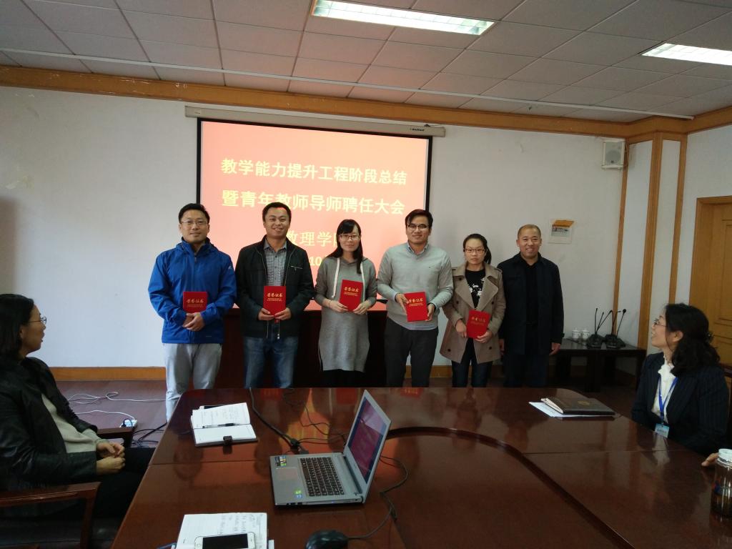 随后,郭广海宣读了青年教师导师制实施办法,对导师和青年教师的要求做了进一步的细化,教务处处长王霞为导师颁发聘书,物理系娄斐老师作为青年教师代表发言。会议还表彰了在教学能力提升工程中获奖的个人,李淑贞、杨树国分别为课件比赛和教学比赛获奖者颁奖。