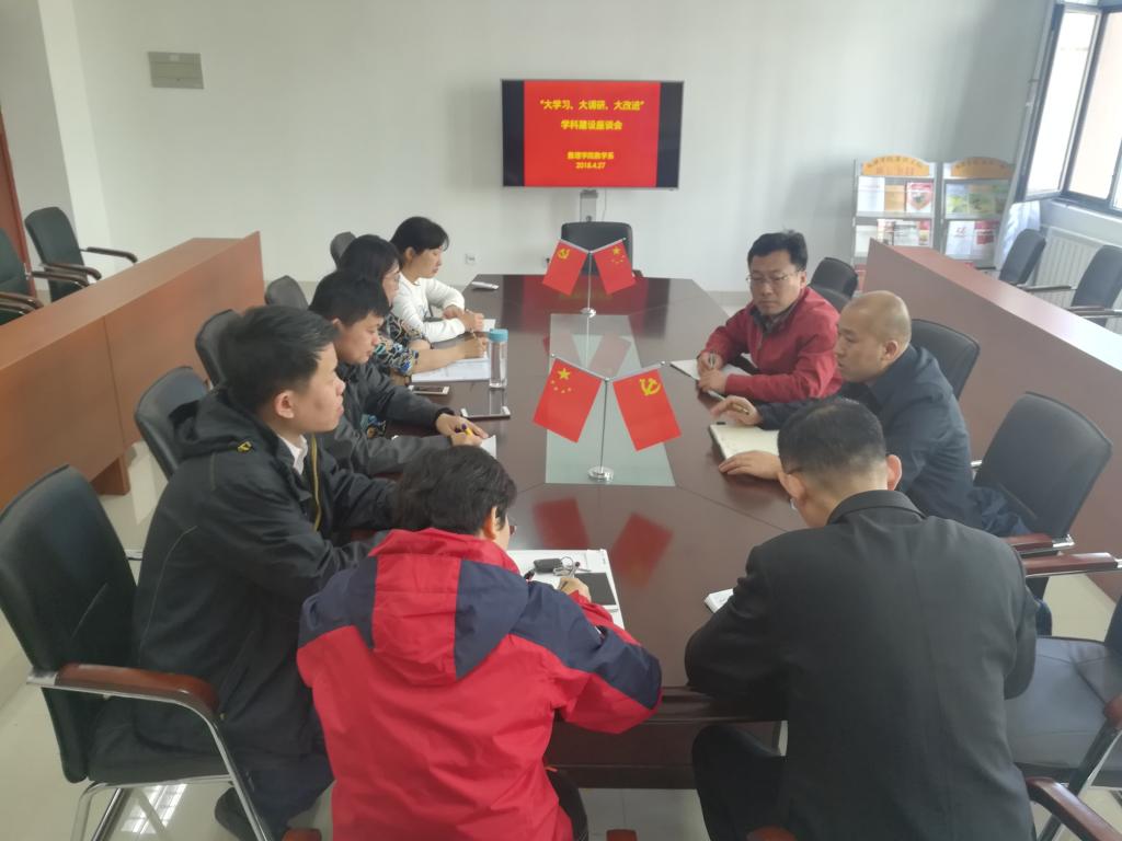 为落实学校关于开展“大学习、大调研、大改进”工作部署的要求,4月27日下午,数学系召开学科建设座谈会,学院院长杨树国教授,副院长王明辉教授,数学系主任李秀丽,副主任张瑞坤以及隋树林教授,数学系各教研室主任等参加了会议,会议由王明辉副院长主持。 研究部署数学系两个硕士点数学和统计学的建设以及发展存在的问题,以及改进措施等相关事宜。与会领导和老师对于数学系的本科和硕士学科各专业现状提出了很多存在的问题,并给出了可行性建议。会议强调,要结合学校、学院工作实际,加强统筹谋划,坚持问题导向,以引进优秀人才为抓手,以现有教学科研资源为基础,积极进取,努力工作,争取顺利通过硕士点的审核评估,提升学院人才培养质量。