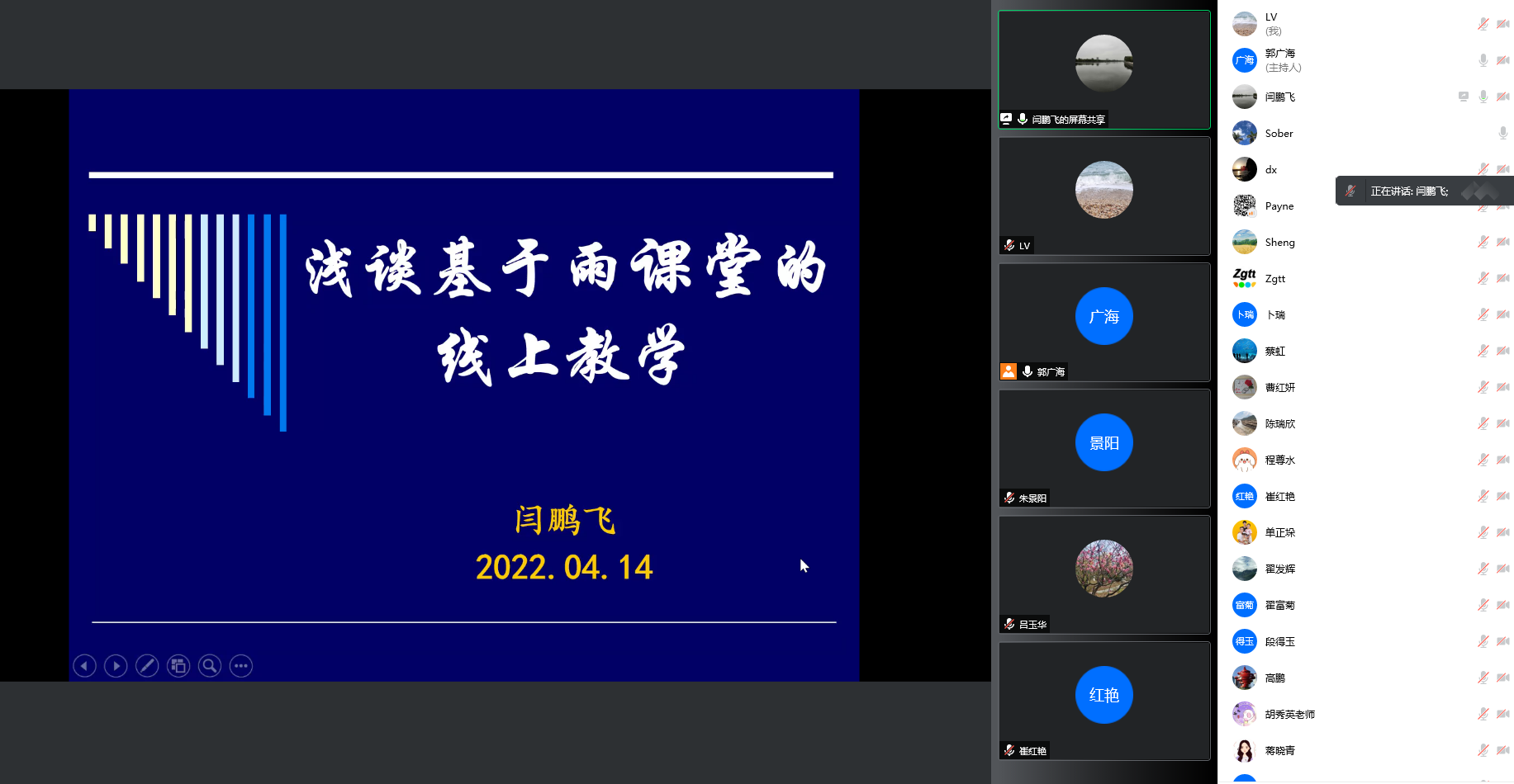 闫鹏飞老师以“雨课堂”为例,结合自己的使用经验,向老师们介绍了具体的操作过程、线上教学优势、5.2版本的实时屏幕共享等功能,结合学生在教室和宿舍的摄像头拍摄,及时了解学生学习状态、与学生进行互动。他从课前预习、课堂开展和课后答疑服务三个方面详细的介绍了雨课堂在在线课程教学中的特点和优势。闫老师提出要将思政元素与讲课内容有效结合,更好地培养学生的家国情怀,促进立德树人,彰显文化自信。