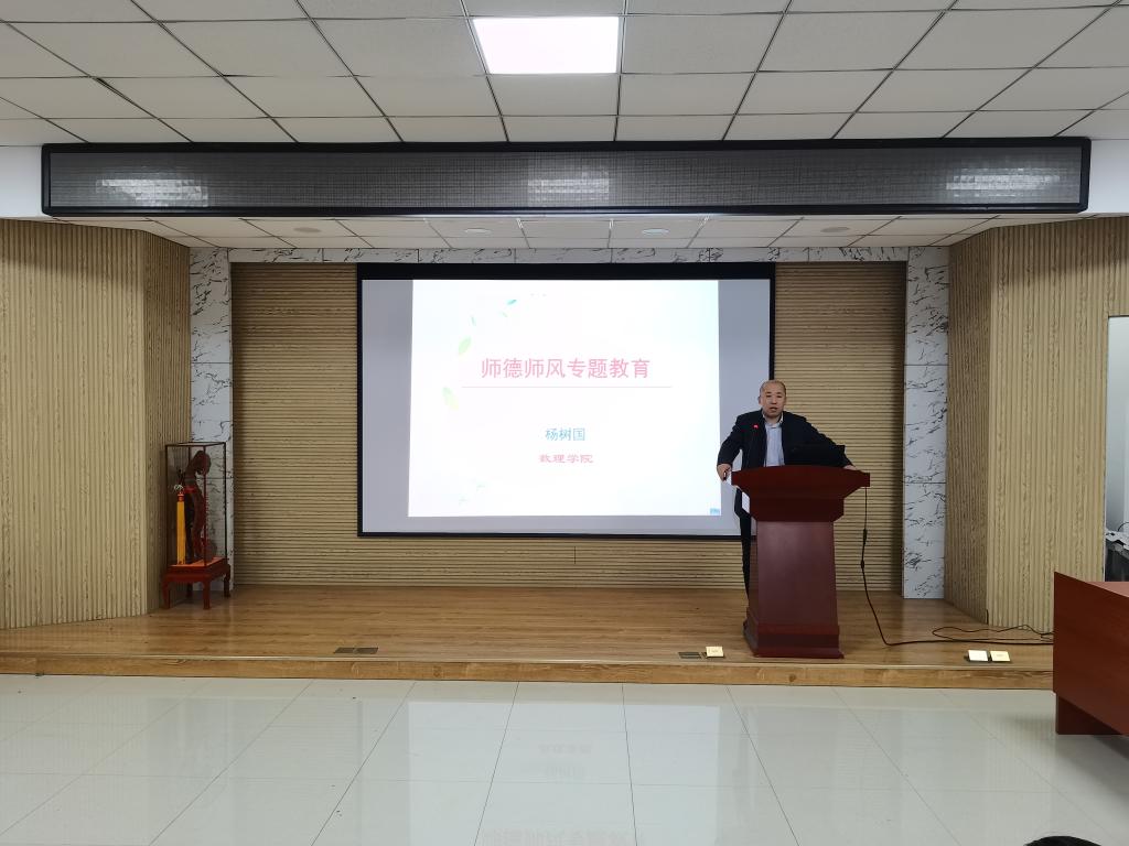 “树师德 正师风”专项整治活动实施方案。杨树国做了师德师风警示教育专题报告,详细解读了高等学校教师职业道德规范、新时代高校教师职业行为十项准则、研究生导师指导行为准则,重点解读了《教育部关于高校教师师德失范行为处理的指导意见》,从高校教师师德失范行为案例视角进行了警示教育。