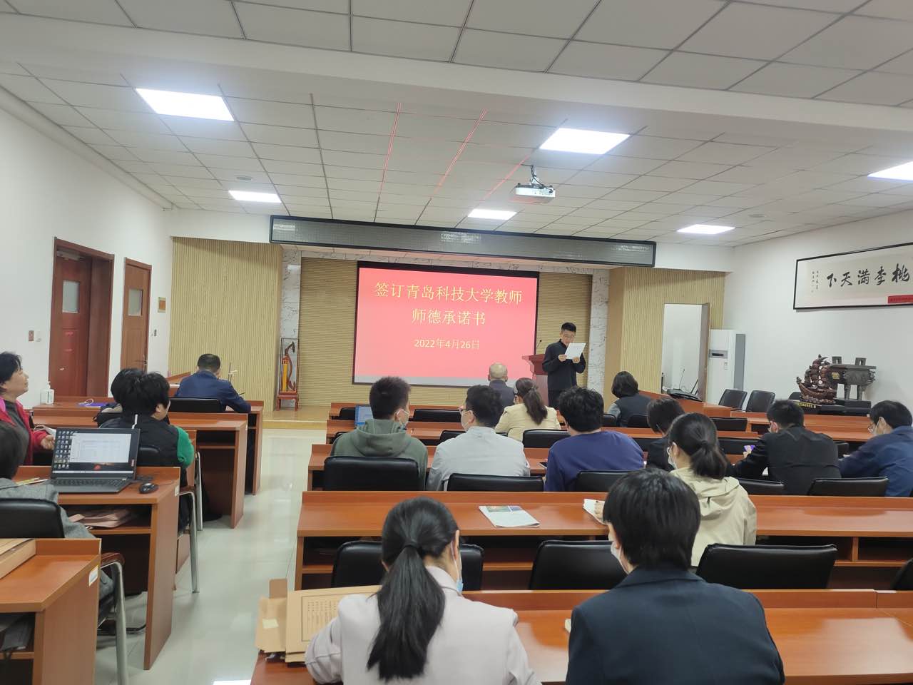 吕浩领学了《青岛科技大学教师师德承诺书》,学院全体教职工在师德承诺书上郑重签字。