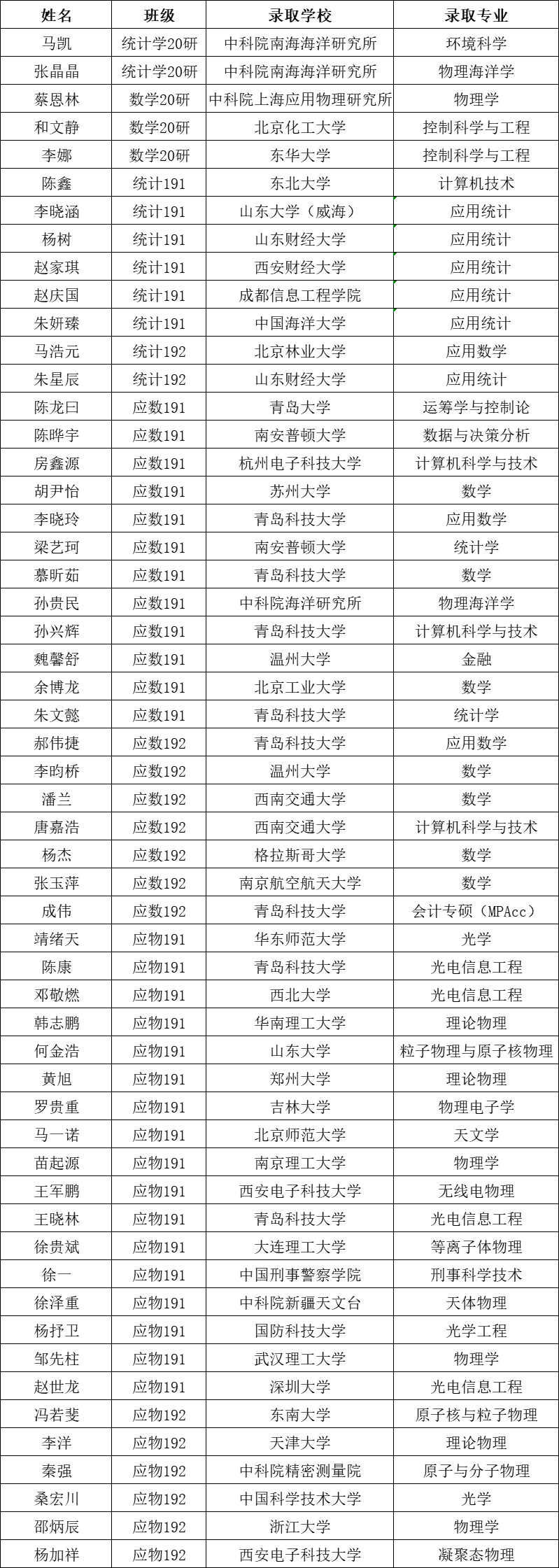2023届毕业生升学深造再创佳绩。2023届毕业生共199人,5名硕士研究生考取博士研究生,50名本科生考取硕士研究生。本科生中,8人保研,42人考取硕士研究生,升学率达29.76%,其中30人被国防科技大学、中国科学技术大学、东南大学等“985”“211”高校录取,占总录取人数的60%;4人考入中科院海洋研究所、中科院新疆天文台、中科院精密测量院、中国刑事警察学院;3人考入格拉斯哥大学、英国南安普顿大学等国外知名院校;应物191班录取率达56.67%,其中“985”“211”院校占82.35%;应物192班邵炳辰同学、应数192班张玉萍同学和应物191班李洋同学分别以411分、394分、392分的成绩被浙江大学、南京航空航天大学、天津大学录取。