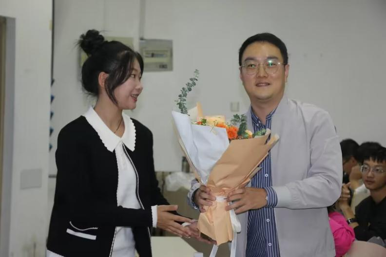 学生代表李文昕向殷文明老师献花,师生情也在“师爱我”这一天再次被见证。