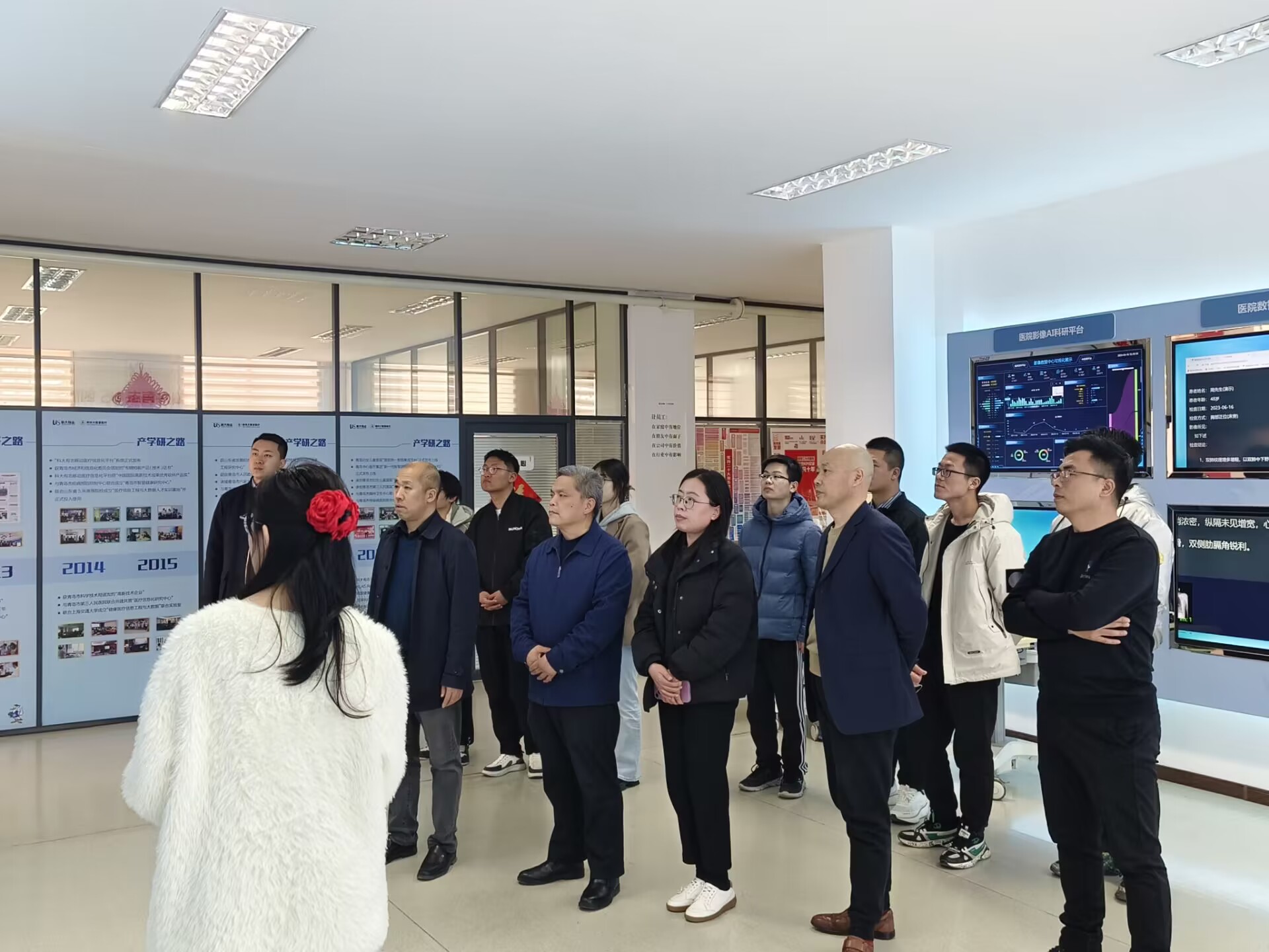 师生在工作人员的引导下先后参观了智慧医疗案例展示区、智慧医院一站式平台、院校合作案例、一体化信息服务模式,详细了解了企业的发展历程、荣誉资质、知识产权、创新成果等。