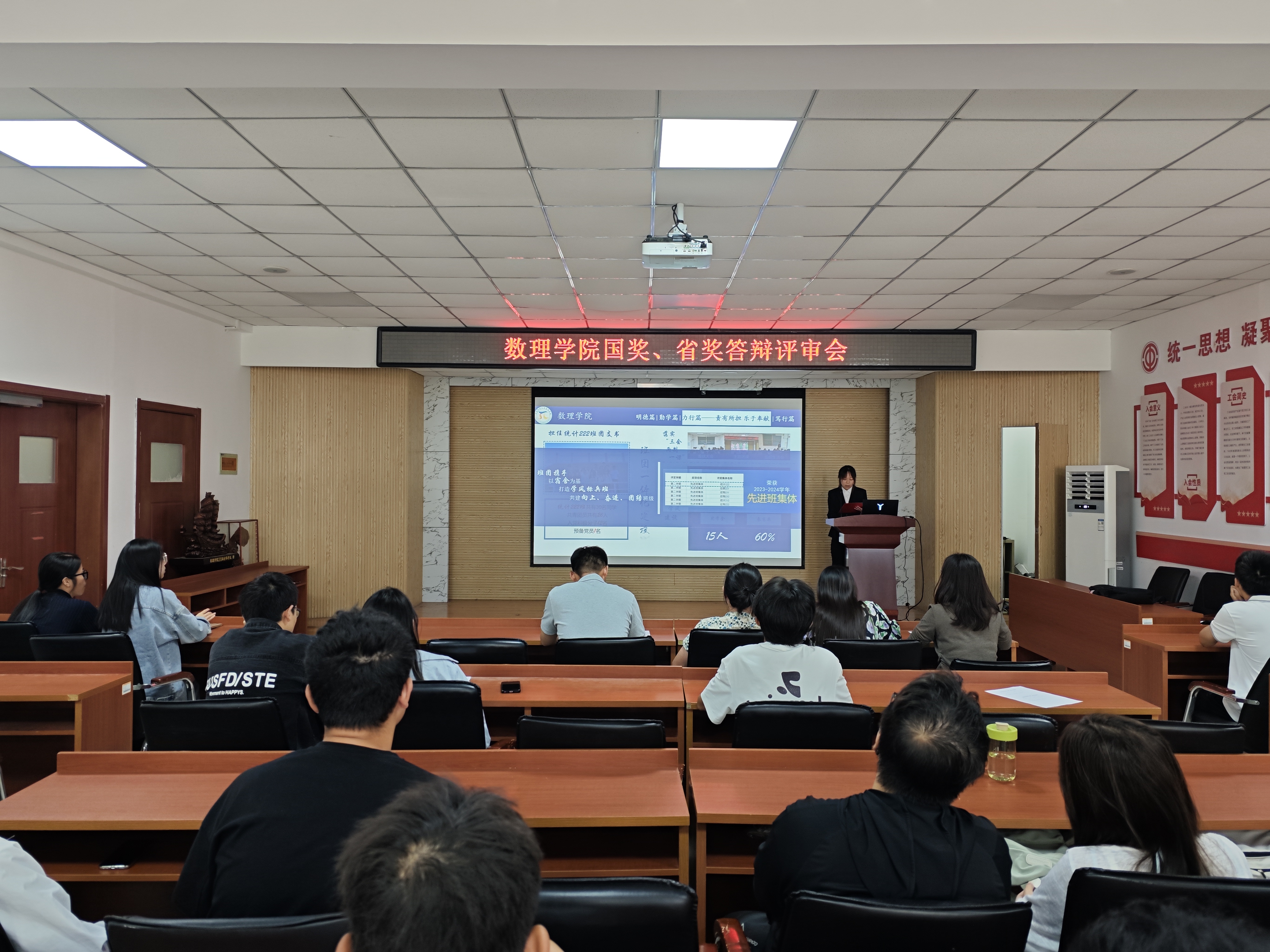 在答辩环节,参选学生依次围绕自身思想政治、专业学习、创新实践、社会服务、文体活动等方面进行阐述。他们努力在思想上追求卓越、在学术上不断突破,同时在各项竞赛和活动中表现出色,展现出全方位发展的数理学子姿态。