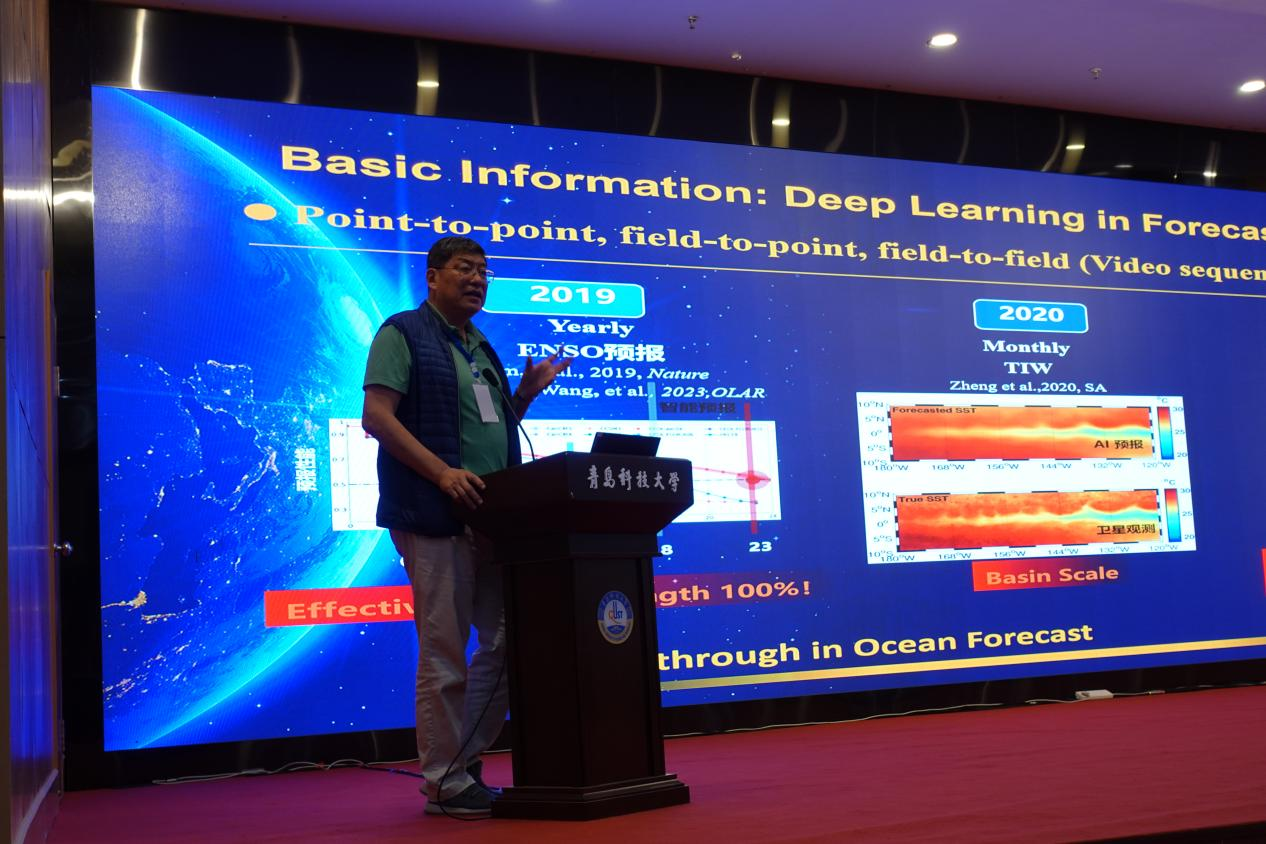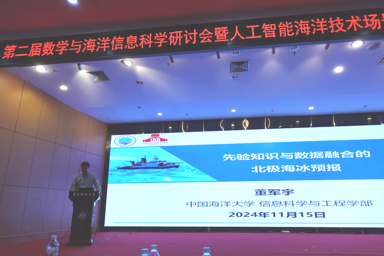 11月15日上午开展了5场大会主旨报告,分别是自然资源部第一海洋研究所乔方利研究员的“海洋模式体系的发展与展望”、中科院海洋所李晓峰研究员的“人工智能海洋预报新进展”、中国海洋大学陈戈教授的“AI时代卫星海洋遥感的思考与展望”、南京信息工程大学董昌明教授的“开发融合物理机制的智能海洋模式”,中国海洋大学董军宇教授的“先验知识与数据融合的北极海冰预报”。