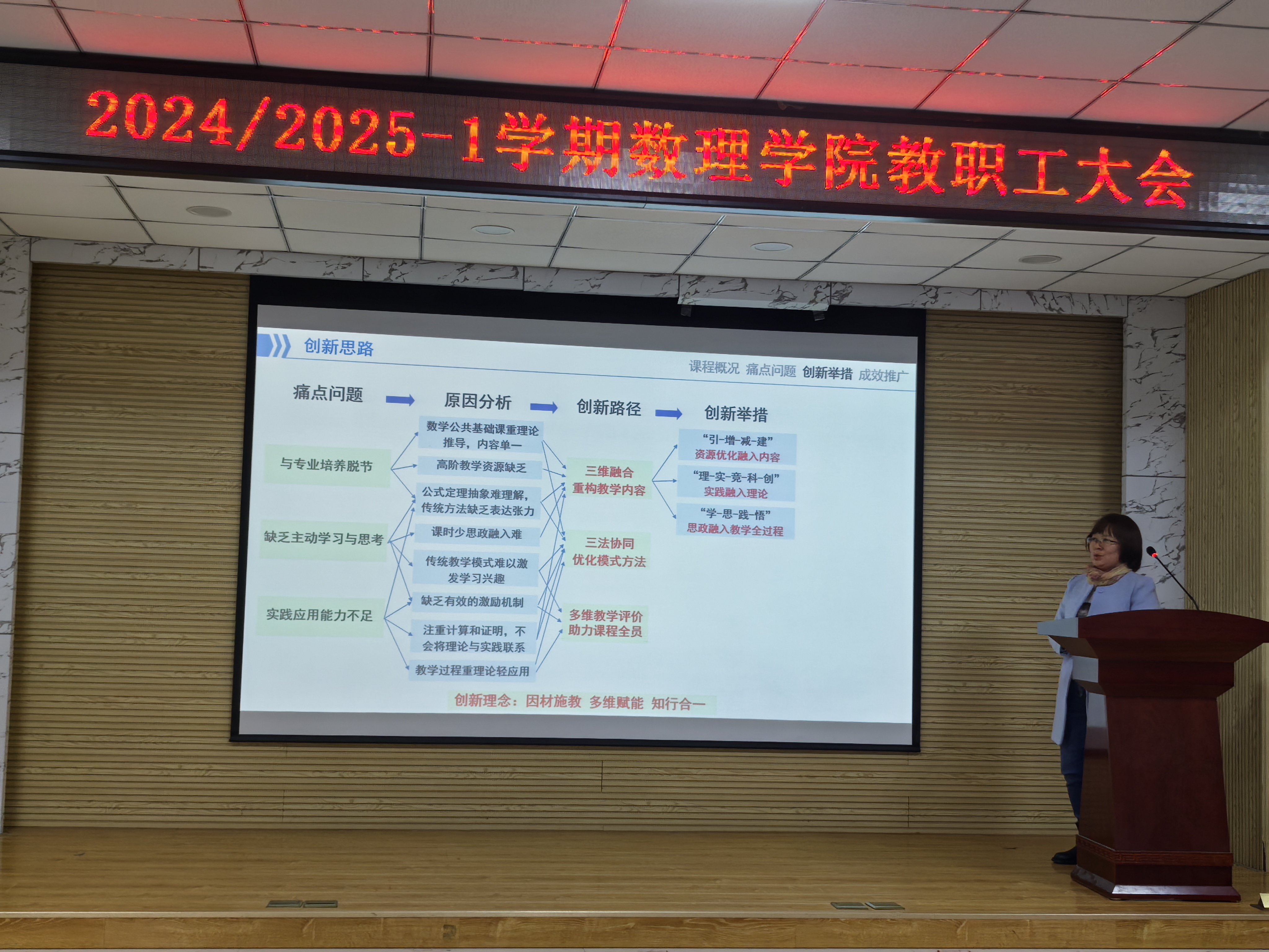 吕浩首先介绍了学院教师教学发展分中心的成立背景和成员组成,表示希望通过搭建这个平台,为教师们提供优质的教育教学服务,促进学院整体教学水平的提升。王建新副教授以“跨专业融合下数学思维的构建”为主题,分享了她在概率论与数理统计课程中的教学创新。她强调通过优化专业需求的教学资源,将实践与理论相结合,融入思政元素,构建三维融合的教学模式,以夯实数学基础,并进行高阶知识的探究与应用。该课程教学方法包括“交互研讨、设疑启思、上云用数”,以优化教学模式,因材施教,培养学生的思辨与实践创新能力,为新工科人才的培养奠定基础。