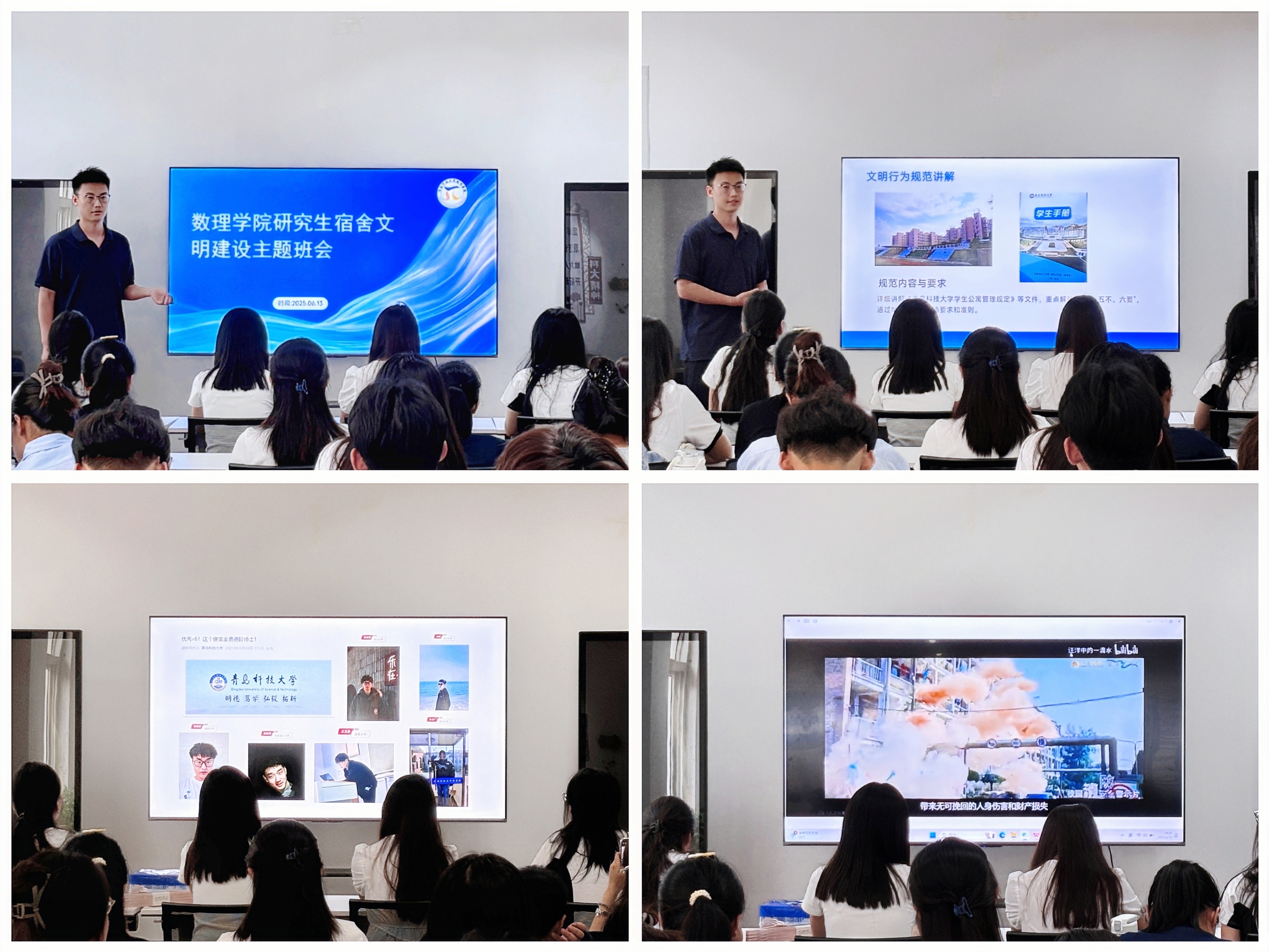 班会涵盖理论学习、方案解读、案例分析、互动讨论、宿舍团建五个环节。丁璇思结合研究生日常,强调宿舍文明建设在“三全育人”中的关键作用,详细讲解了公寓文明规范和卫生检查标准,并围绕“四勤、五不、六要”学生公寓文明行为规范提出问题,引导同学们讨论交流。通过全员申博成功优秀宿舍与反面火灾警示案例对比,直观呈现文明宿舍建设的重要意义。最后的“宿舍默契挑战”活动,让同学们在欢乐中增进了彼此信任与情谊。