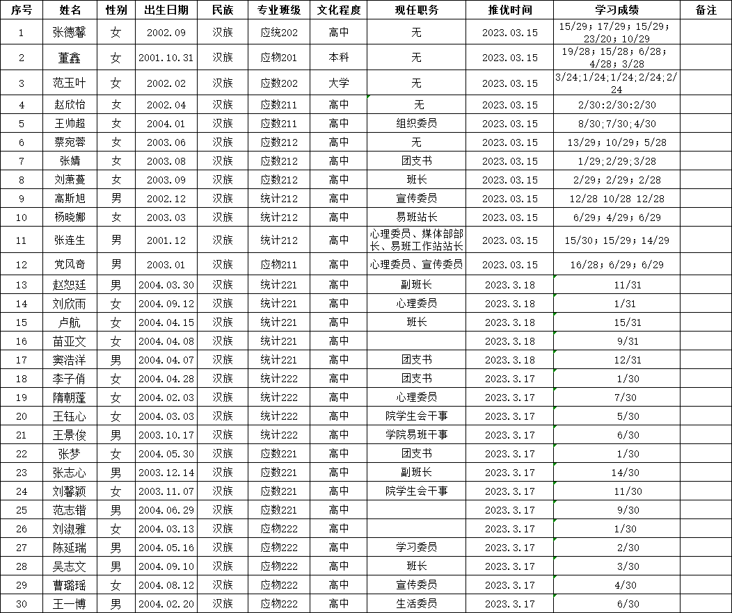经偷拍厕所 本科生各团支部全体团员大会讨论推荐,偷拍厕所 团委研究决定,拟定推荐张德馨等30名同学为入党积极分子,现公示如下,如有异议,可在公示期内来电反映。