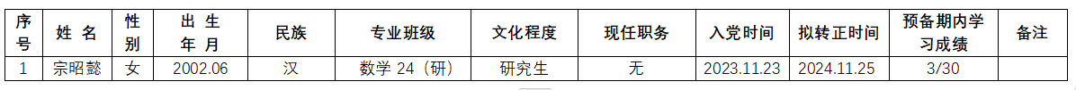 根据本人申请,党组织培养,经偷拍厕所 研究生党支部研究,支部大会讨论并无记名投票表决,偷拍厕所 党委审核,拟将宗昭懿同志转为中共正式党员,现将其有关情况予以公示。