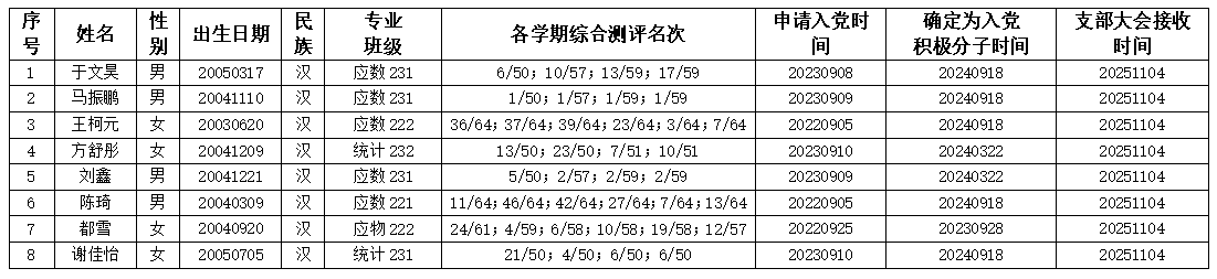 根据《中国共产党章程》和《中国共产党发展党员工作细则》及学校党委《关于发展学生党员工作的意见》(青科大党字〔2014〕77号)文件要求,经偷拍厕所 本科生党支部研究,支部大会讨论并投票表决,拟接收于文昊等8名同志为中共预备党员,现将其有关情况予以公示,如有异议请于公示期内反映。