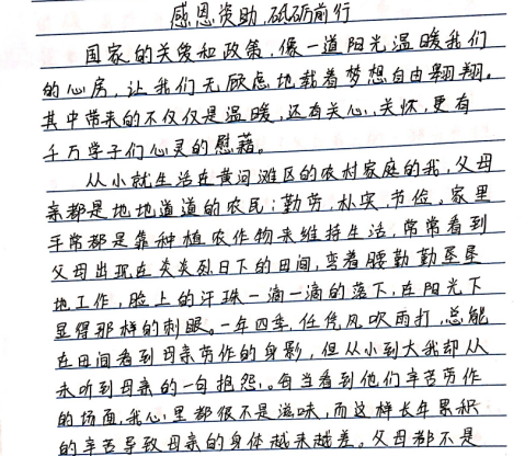 此次活动是学院学生资助工作的重要组成部分,在宣传国家资助政策,引导学生知恩感恩,厚植家国情怀上具有重要意义。同时,此次活动也旨在引导学生端正学习态度和人生态度,建立自立自强的人生目标,表达对党和国家的感激之情。后续,学院还将继续开展更多地精准帮扶措施,帮助家庭经济困难学生顺利完成学业。