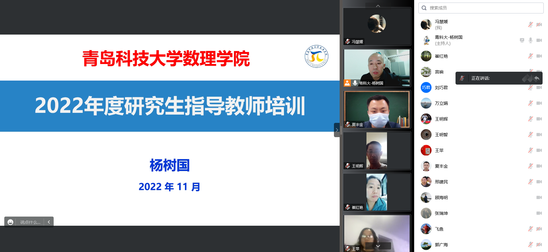 杨树国院长向导师们传达了学校最新发布的关于研究生培养和教育管理的最新政策和文件,着重学习了《关于全面落实研究生导师立德树人职责的意见》,和《青岛科技大学研究生指导教师管理办法》(修订)等文件,结合学院实际情况,对导师提出了新的要求,并列举了几项违反师德师风和学术不端问题,希望导师们提高警惕引以为戒。
