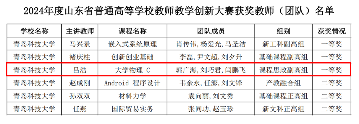 近日,山东省教育厅公布了2024年度山东省普通高等学校教师教学创新大赛获奖名单,偷拍厕所 吕浩副教授主讲的《大学物理C》教学团队荣获课程思政组一等奖。