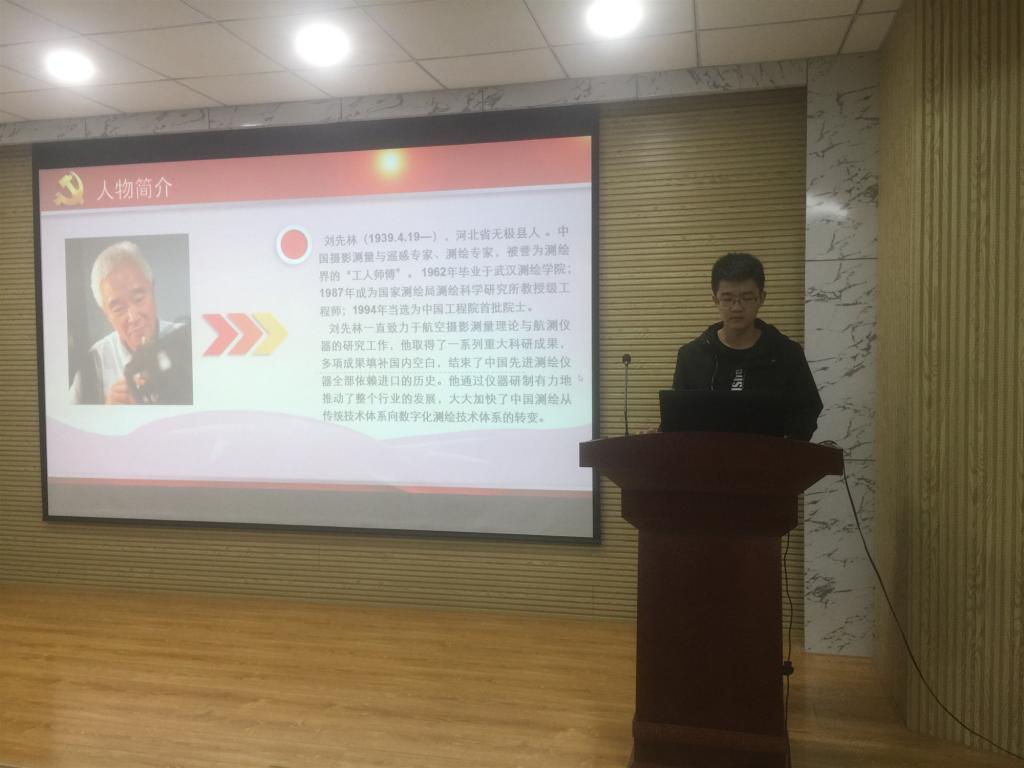 之后,党员先锋讲坛开始,徐思拓同学向大家介绍了先进党员刘先林院士的相关事迹,通过文字,视频和相关图片向大家展示了一位爱国,爱党,爱家,爱生活;工作勤劳认真;朴实,不做作;投身科研,无怨无悔的老一辈先进党员形象,在座的各位党员受益匪浅,颇有感触。