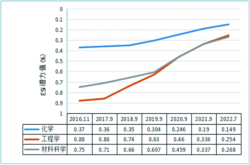 图1 化学、材料科学、工程学3个学科ESI排名变化情况