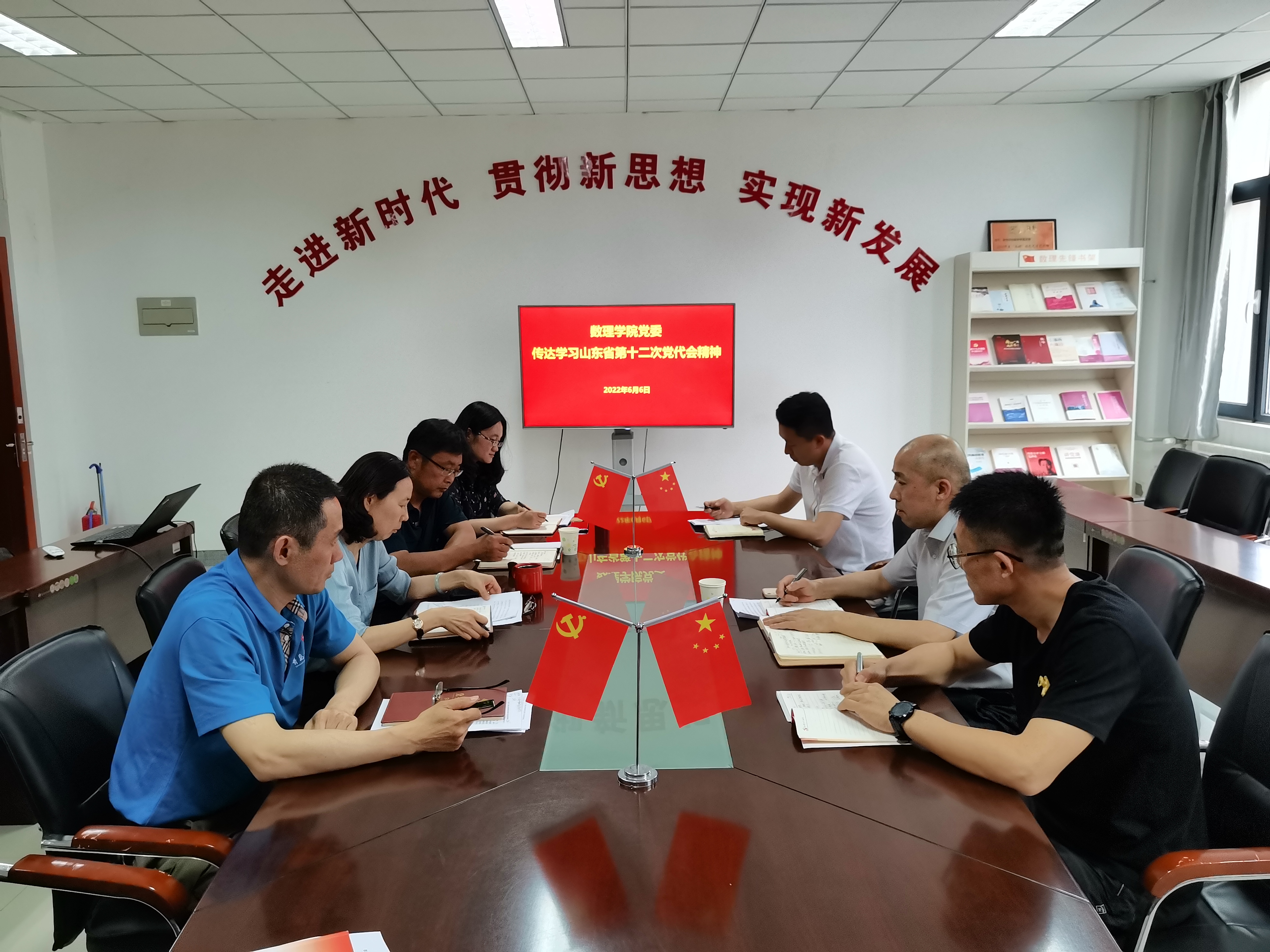 李淑贞指出山东省第十二次党代会是在喜迎党的二十大、向着第二个百年奋斗目标迈进的关键时刻,在山东新时代社会主义现代化强省建设的关键节点,召开的一次十分重要的会议,是全省人民政治生活中的一件大事。要深入学习领会省党代会精神重大意义,通过“三会一课”、主题党日等,发挥“关键少数”的示范带动作用,切实把思想行动统一到习近平总书记重要指示要求上来,进一步统一思想、凝聚共识,更好指导推动学院高质量发展;要深刻领会,突出重点,准确把握省第十二次党代会精神的核心要义,认真学习贯彻党代会精神,准确把握学院发展的基础、优势、机遇,推动党的建设和学院各方面工作实现新跨越;要进一步强化作风建设,弘扬“严真细实快”的工作作风,围绕学院中心工作和发展目标,创新工作思路,提高工作质效,第一时间把省委、学校各项要求落到实处,以优异成绩向党的二十大献礼。