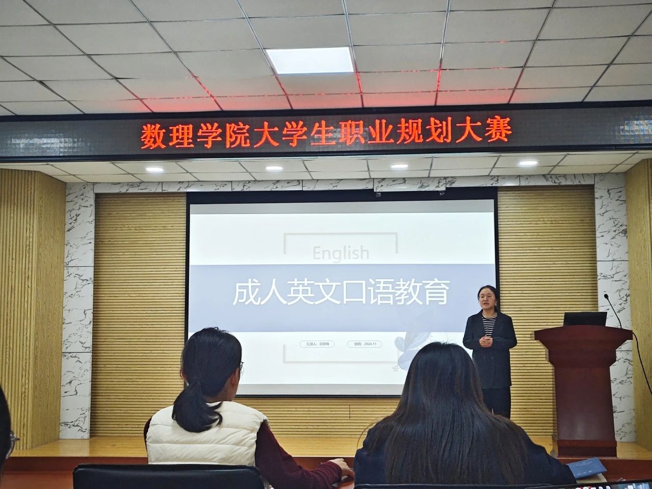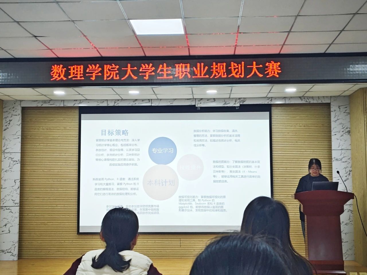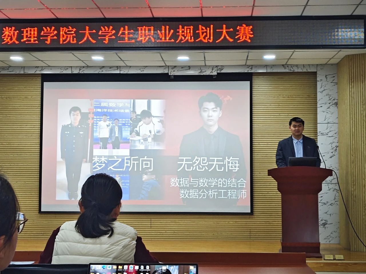 大学生职业规划大赛在D2-220举办。本次大赛以“筑梦青春志在四方,规划启航职引未来”为主题,分成长和就业两个赛道进行。学院学工办主任付凯,辅导员刘敏、丁璇思及各年级学生代表担任评委,全体参赛选手到场观摩。