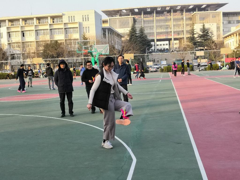比赛的第三个项目是踢毽子,老师们身手矫健,或灵活跳跃、或里勾外挑,个个都拿出了看家的本领。