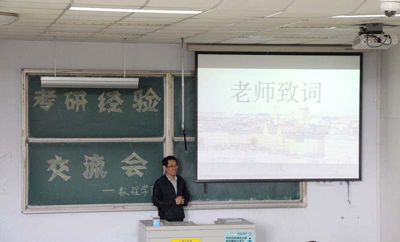 副院长王明辉给大家带来了精彩的演讲,以自己的经历和身边的人为例,幽默风趣、意味深长,给大家启发,鼓舞了大家考研的信心。随后,数学系主任李秀丽就数学方面的考研情况给大家带来了分享,并通过几个关键词展开,从细节方面给了大家关于考研的具体建议,让大家有了切实可行的行动措施,获益匪浅。接下来,张帅一老师也结合自己的经历和自己的教学经验,把自己所知道的关于考研的经验一一传授给大家。考研的前辈们从细节等各个方面向与会同学分享的心得。最后,葛夫国老师做总结发言,为交流会画上了圆满的句号。
