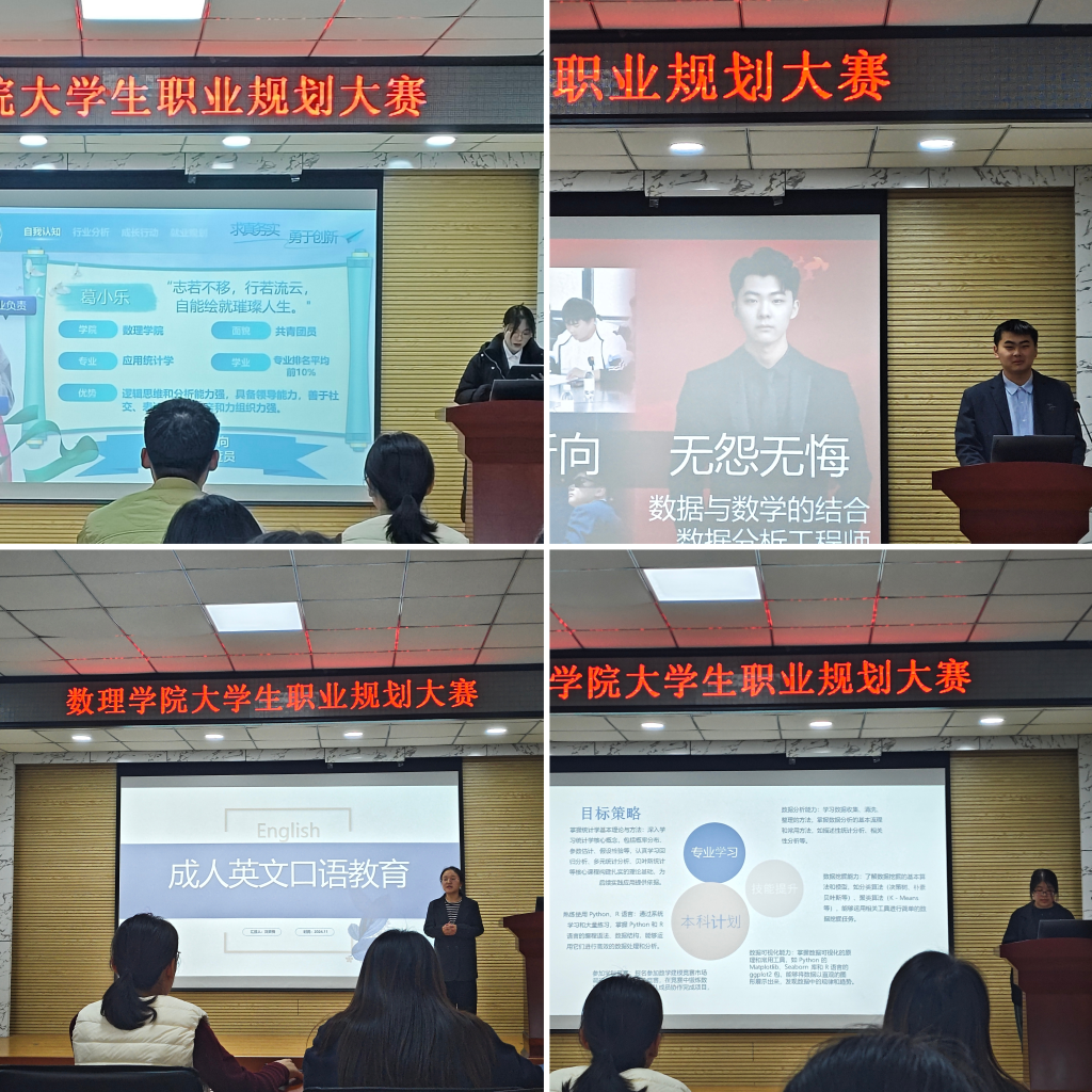 大学生职业规划大赛在D2-220举办。本次大赛以“筑梦青春志在四方,规划启航职引未来”为主题,分成长和就业两个赛道进行。学院学工办主任付凯,辅导员刘敏、丁璇思及各年级学生代表担任评委,全体参赛选手到场观摩。